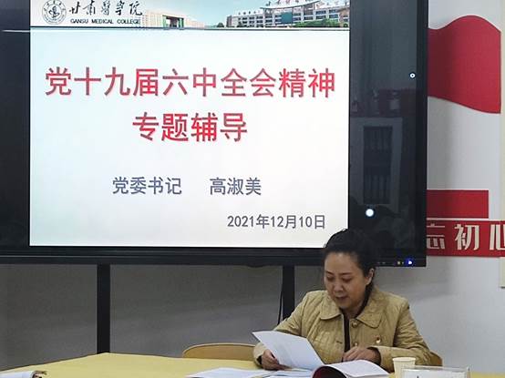 近日,学院党委书记高淑美深入基础医学院(公课部)党总支,围绕党的十九届六中全会精神作专题宣讲,基础医学院(公课部)党总支书记周凤娟主持宣讲报告会,全体党员干部参加。